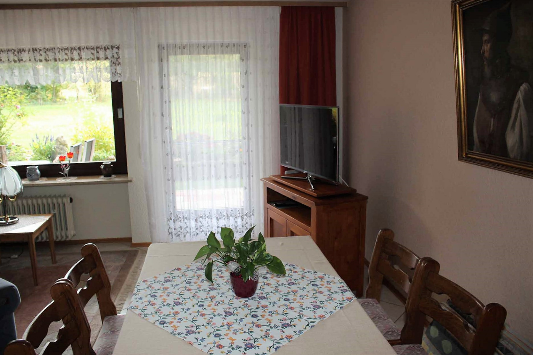 Ein geräumiges Wohnzimmer mit Panoramablick, komfortabel eingerichtet, mit zusätzlicher Essecke und Flachbild-TV. WLAn ist auf Wunsch vorhanden.